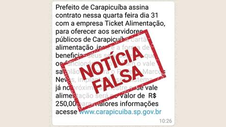 NOTÍCIA FALSA - Atenção servidores e munícipes, a Prefeitura de Carapicuíba informa que está circulando em grupos de WhatsApp uma INFORMAÇÃO FALSA ...