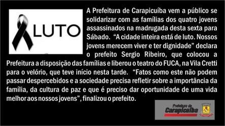 A Prefeitura de Carapicuíba vem a público se solidarizar com as famílias dos quatro jovens assassinados na madrugada desta sexta para sábado. “A ...