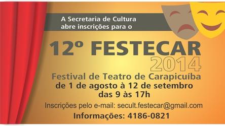A Prefeitura de Carapicuíba, por meio da Secretaria Municipal de Cultura e Turismo, abre inscrições para o 12º Festecar – Festival de Teatro de Ca ...