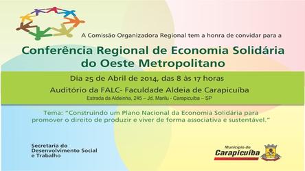Carapicuíba realiza nesta sexta-feira, 25, a Conferência Regional de Economia Solidária do Oeste Metropolitano no Auditório da Faculdade Aldeia ...