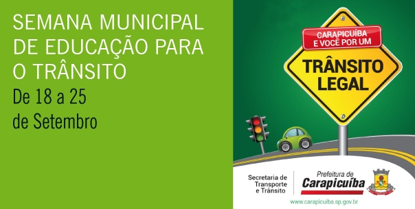 Entre os dias 18 e 25 de setembro Carapicuíba celebra a Semana Nacional de Trânsito 2013. Neste ano a Prefeitura vai enfatizar a conscientização de motoristas e pedestres sobre a importância da responsabilidade de todos na prevenção de acidentes. O tema deste ano é Carapicuíba e Você por um Trânsito Legal.
