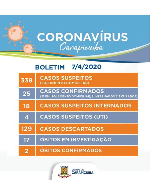 A Prefeitura de Carapicuíba continua trabalhando para conter o avanço do coronavírus na nossa cidade. Nesta terça-feira, o município registrou a cura de dois pacientes do Covid-19. Porém, já são mais de 300 casos suspeitos de coronavírus no nosso município, aguardando resultado de exames do Instituto Adolfo Lutz.